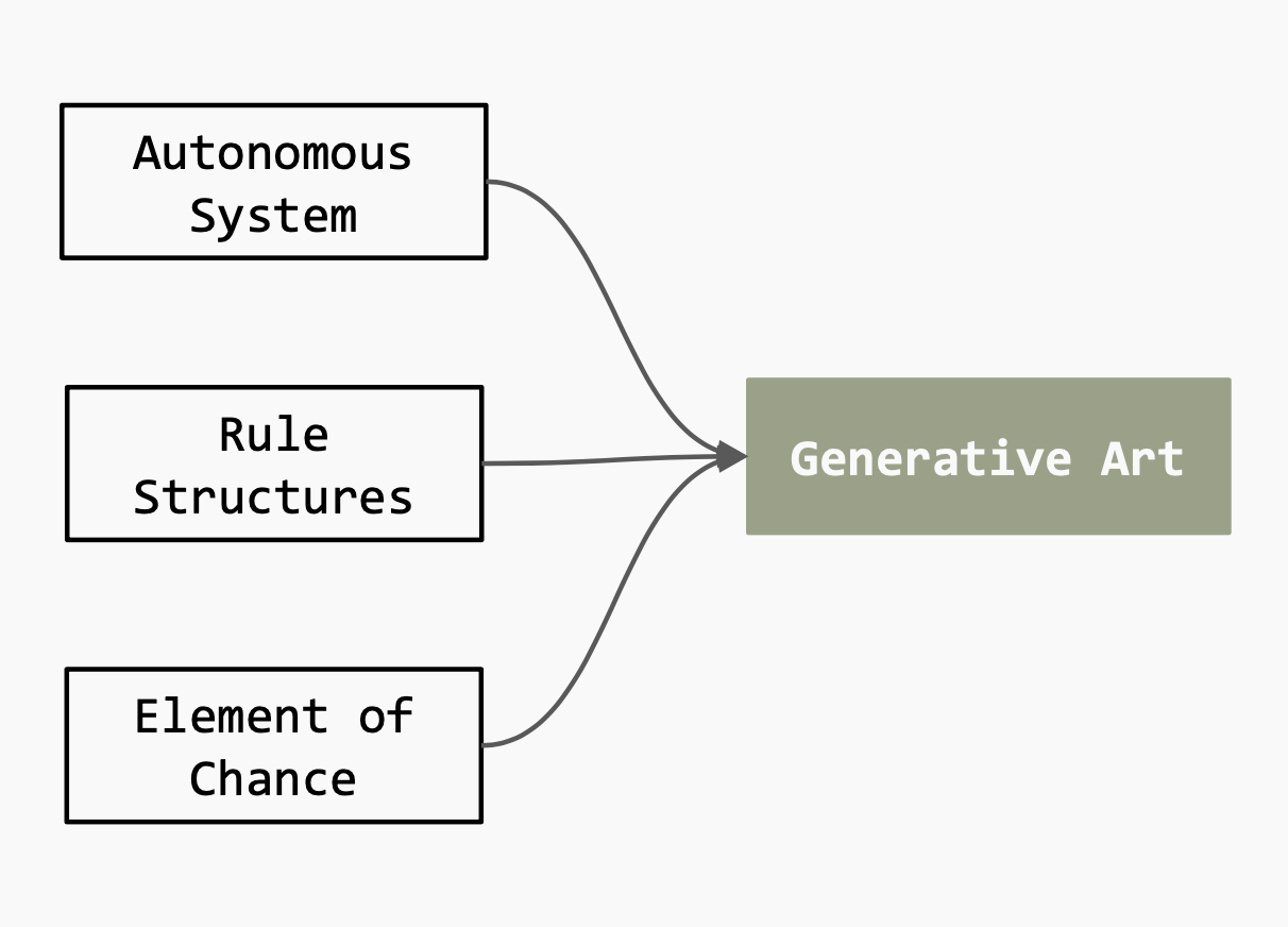 “Generative art operates within a rule structure but has an element of chance that is crucial to what many artists enjoy about it. The final work is partly produced by an autonomous system, which may be strictly regulated by the rules or operate within parameters.”