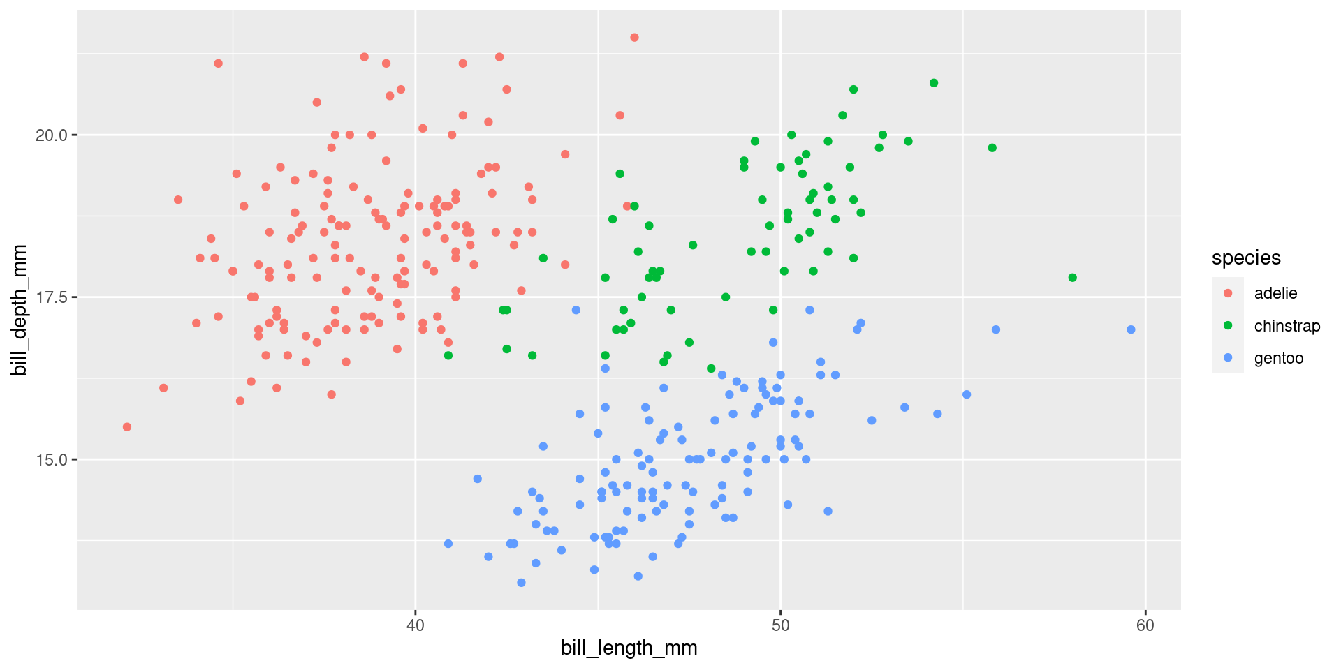 ggplot(penguins, aes(x = bill_length_mm, y = bill_depth_mm, color = species)) +